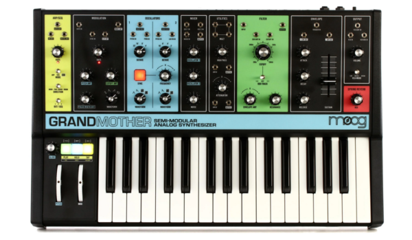 The Moog Grandmother is a semi-modular analog synthesizer designed for hands-on sound creation and live performance. It features a 32-key keyboard and classic Moog analog circuitry, delivering rich tones and flexible sound design options.